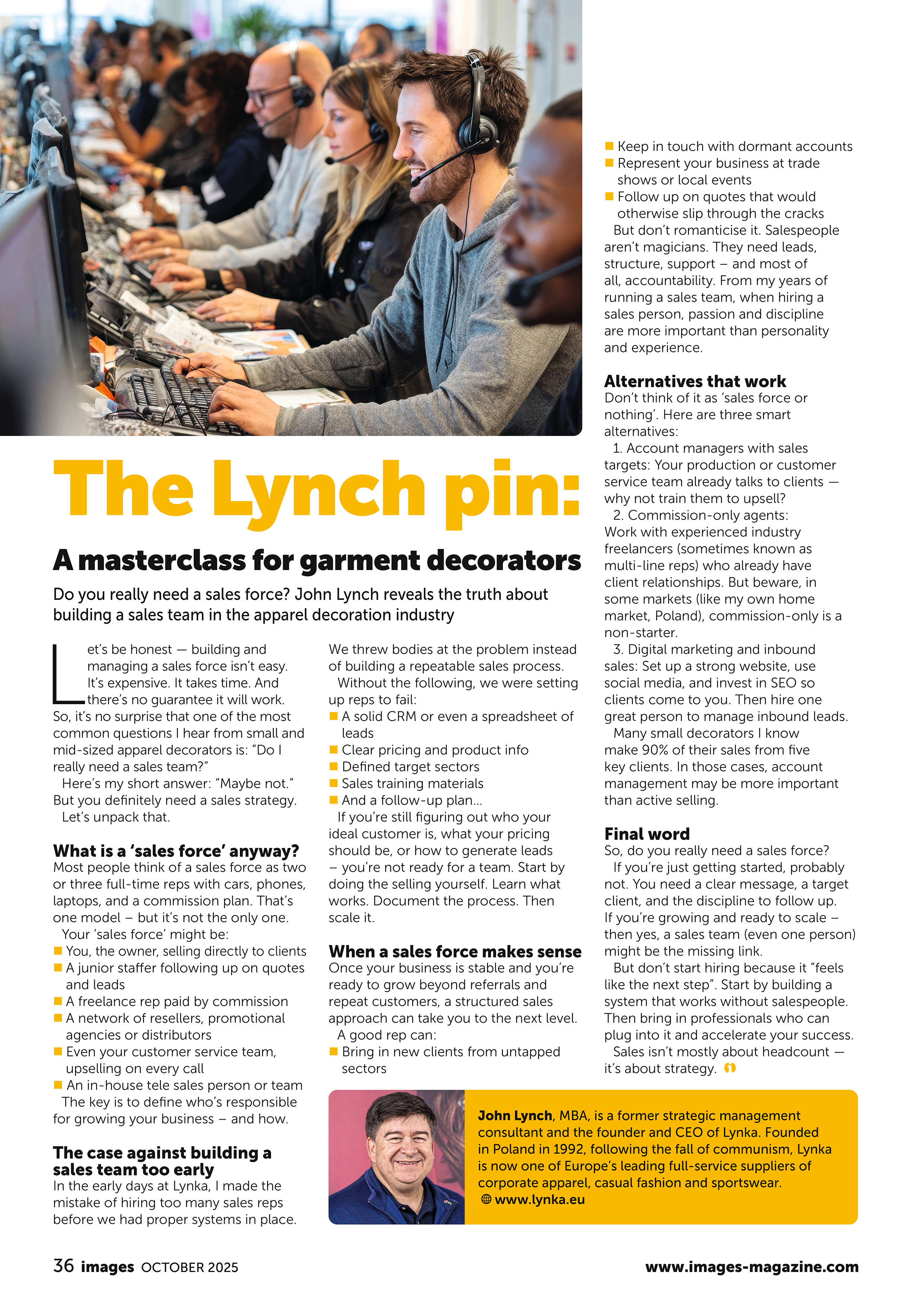 Originally published in Images Magazine, this piece by John Lynch, CEO of Lynka, takes a frank look at something many garment decorators and promotional apparel businesses struggle with: when (and whether) to build a sales team.